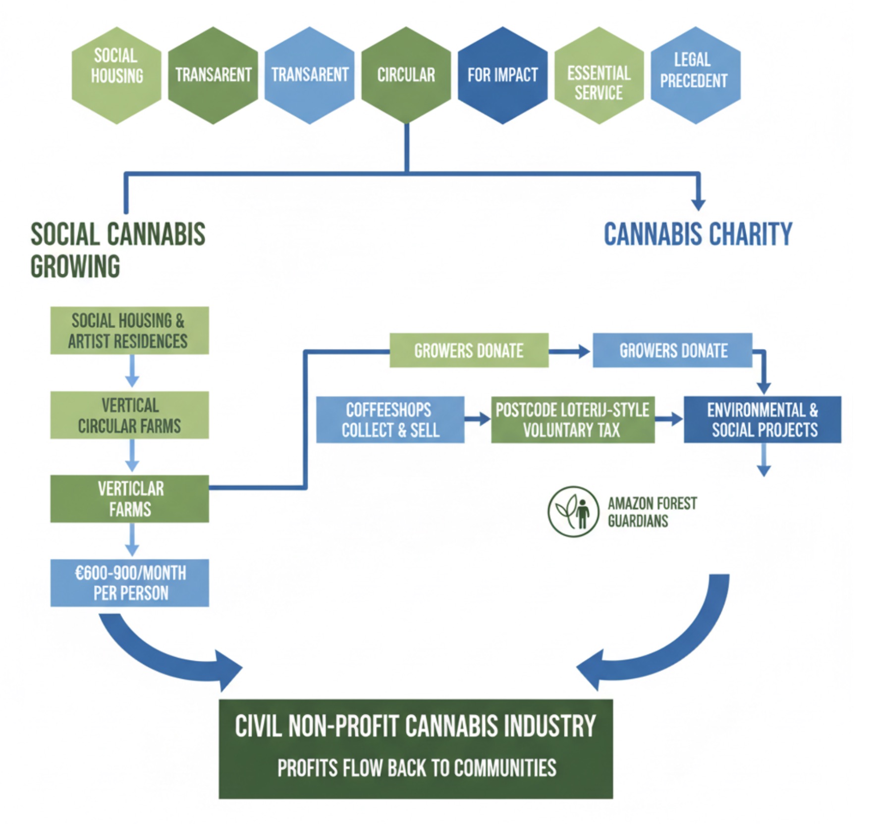 The Duurzame Cannabis Coalitie proposes a legal, transparent cannabis industry where growers and coffeeshops become agents of social change. Five plants per person. Zero waste. Circular energy. Profits that protect forests and help those in poverty. A new model for drug policy that works.